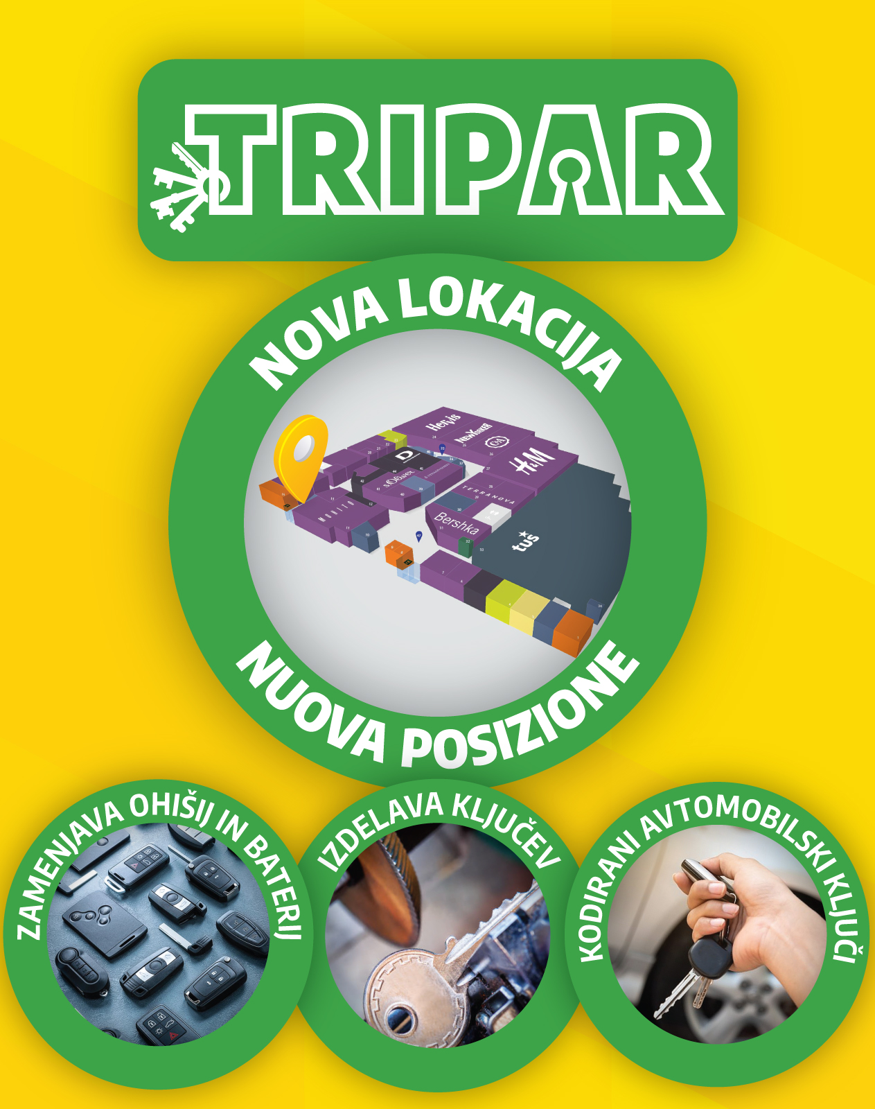 Ključavničarstvo Tripar ponuja izdelavo ključev, avtomobilsko kodirane ključe, avtomobilske ključe z daljincem, ohišja za avtomobilske ključe, sisteme zaklepanja, ključavnice, cilindrične vložke, pohištveno okovje, brušenje nožev in škarij, brušenje verig, fotokopiranje in ključavničarska dela. Dobrodošli!